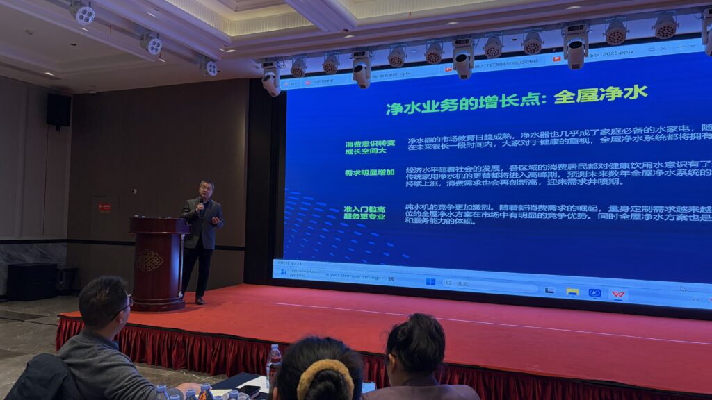 峰会现场,森乐净水华东区营销总监带来《“净水+暖通”集成营销破局》专题分享,拆解实战案例:针对上海老旧小区水质复杂问题,定制“前置过滤+中央软水”刚需套餐,成为终端拓客利器。同时,分享还涵盖终端获客技巧 —— 如何借助短视频平台打造“暖通 + 净水”科普内容,吸引精准客户;如何通过老客户裂变活动,降低获客成本。