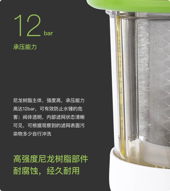 对于高水压地区及高层住户,在水压不稳定的情况,可调节控压阀,保证家中用水的水压稳定,避免涉水家电的使用安全;同时配备了专用表盘式压力表可清晰观察管道压力,有效保护管路。